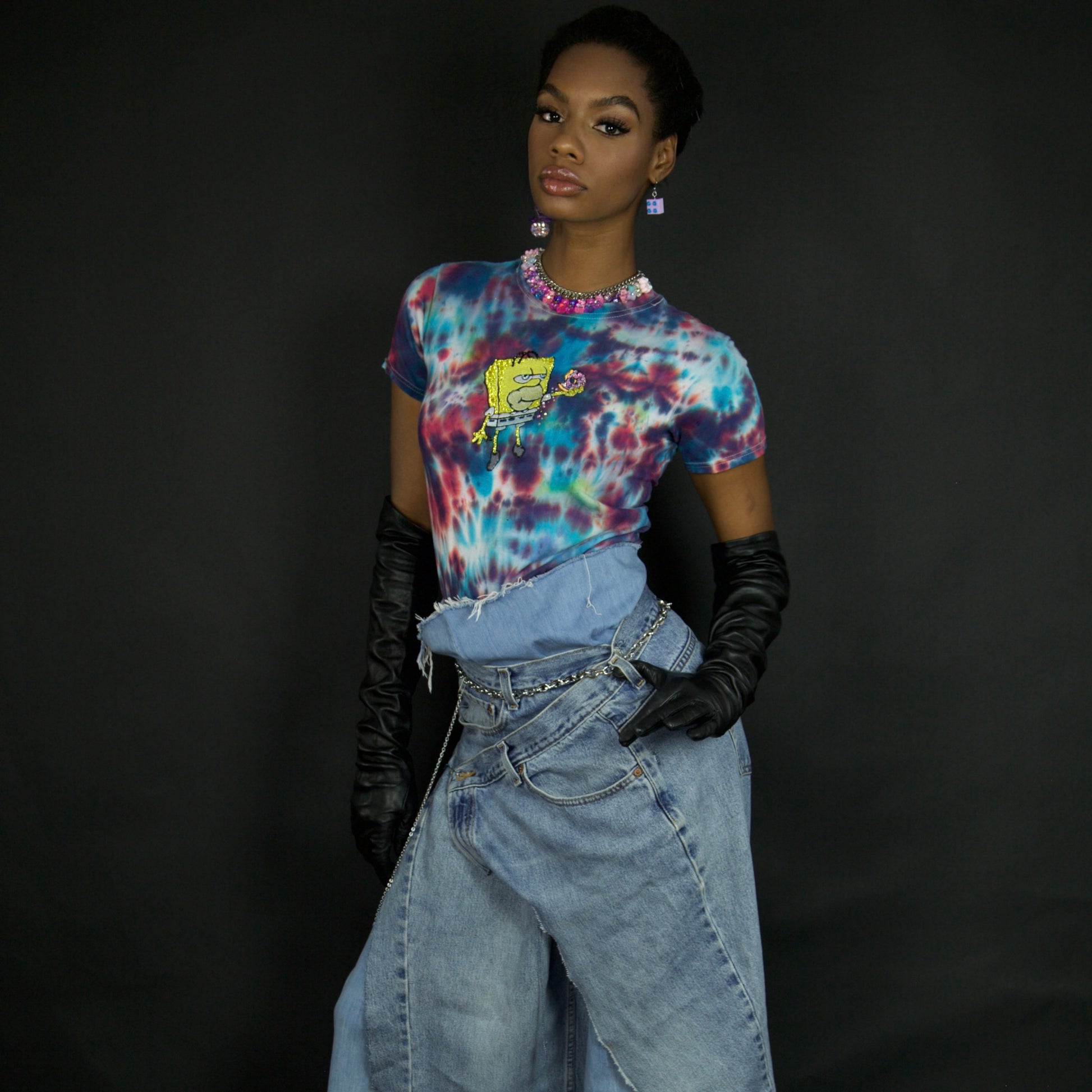 Casil wears a pair of the swarovski dotted neon dice earrings.