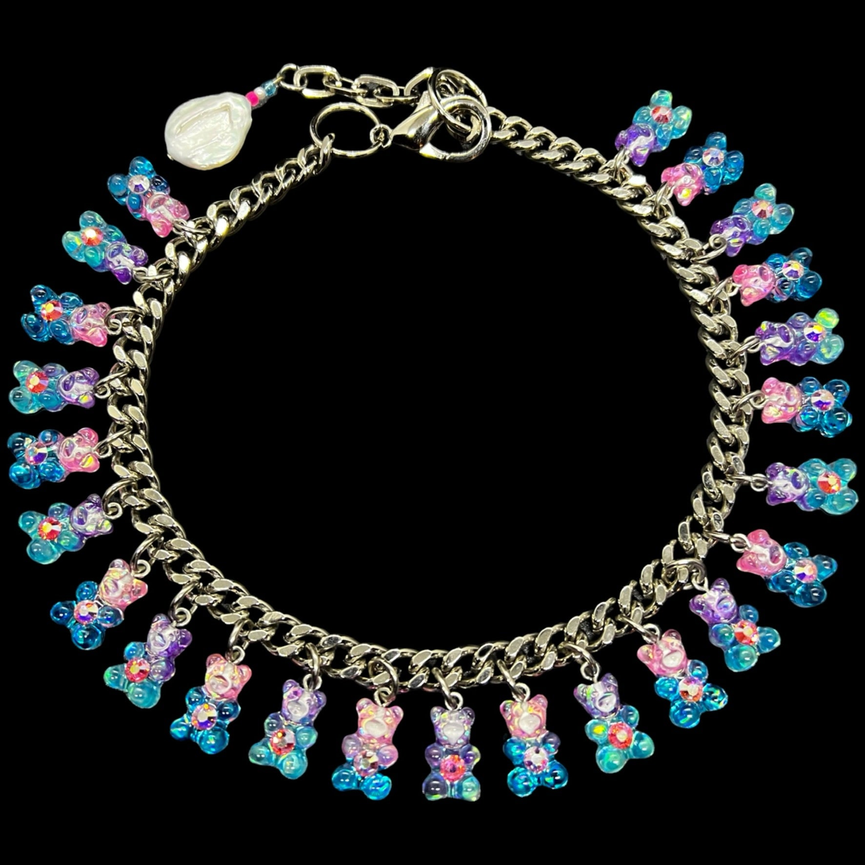 Find a unique variant and add our whimsical yet sophisticated gummy bear necklace to your collection. The sleek and reflective silver steel chain, paired with the vibrant and sparkling gummy bear charms will be sure to catch every ones attention :)