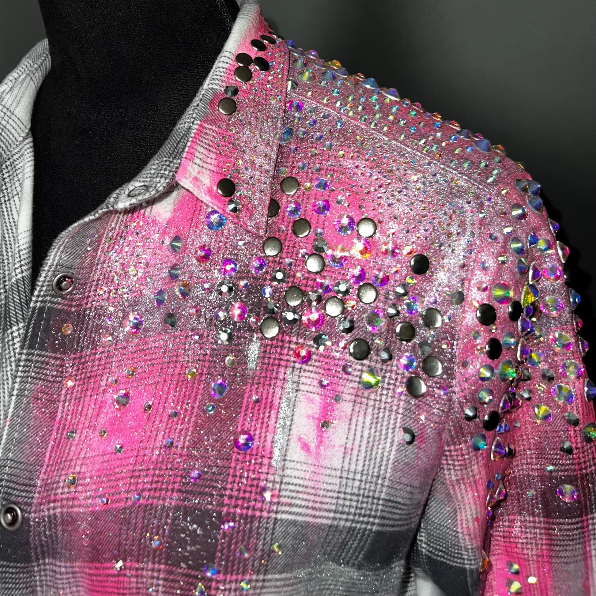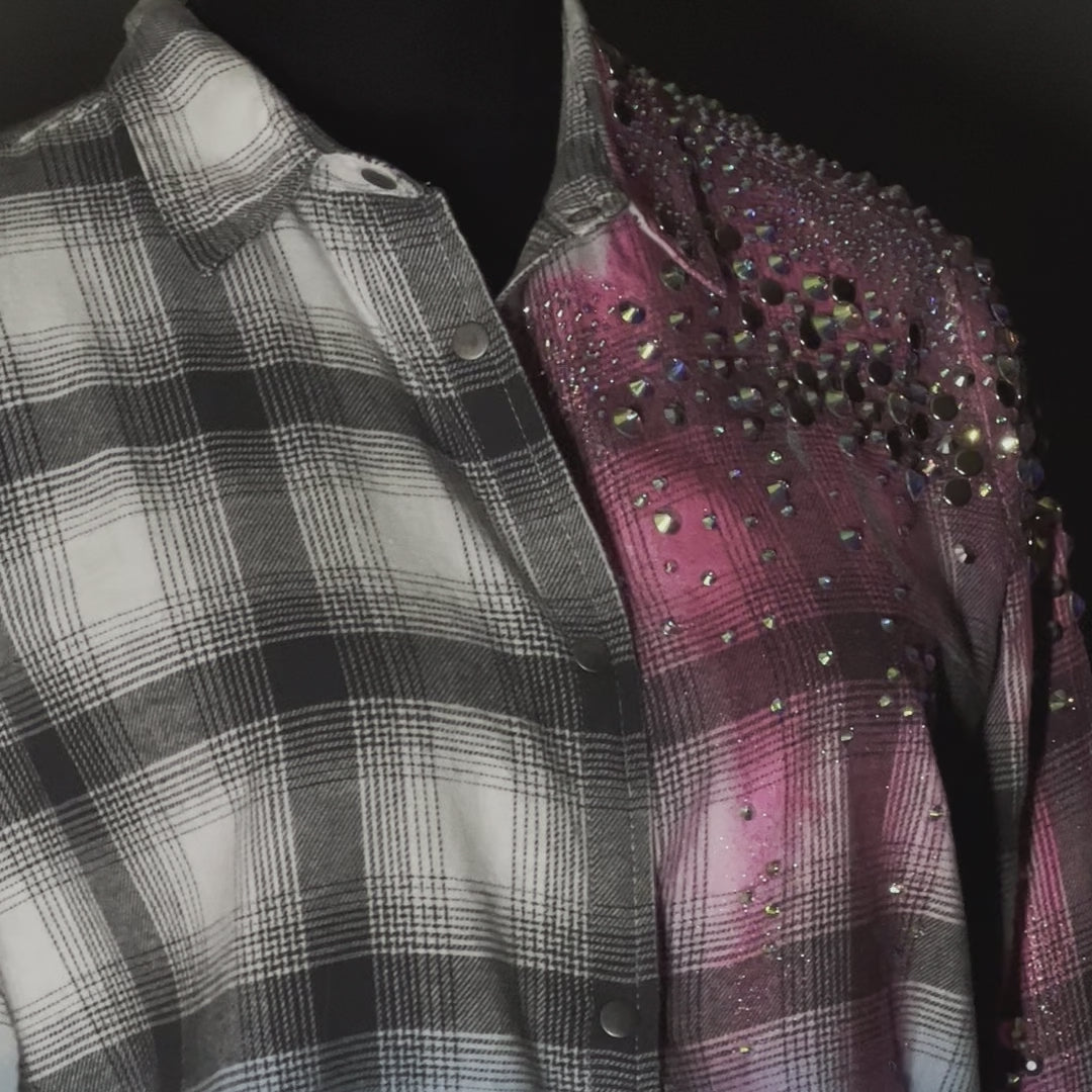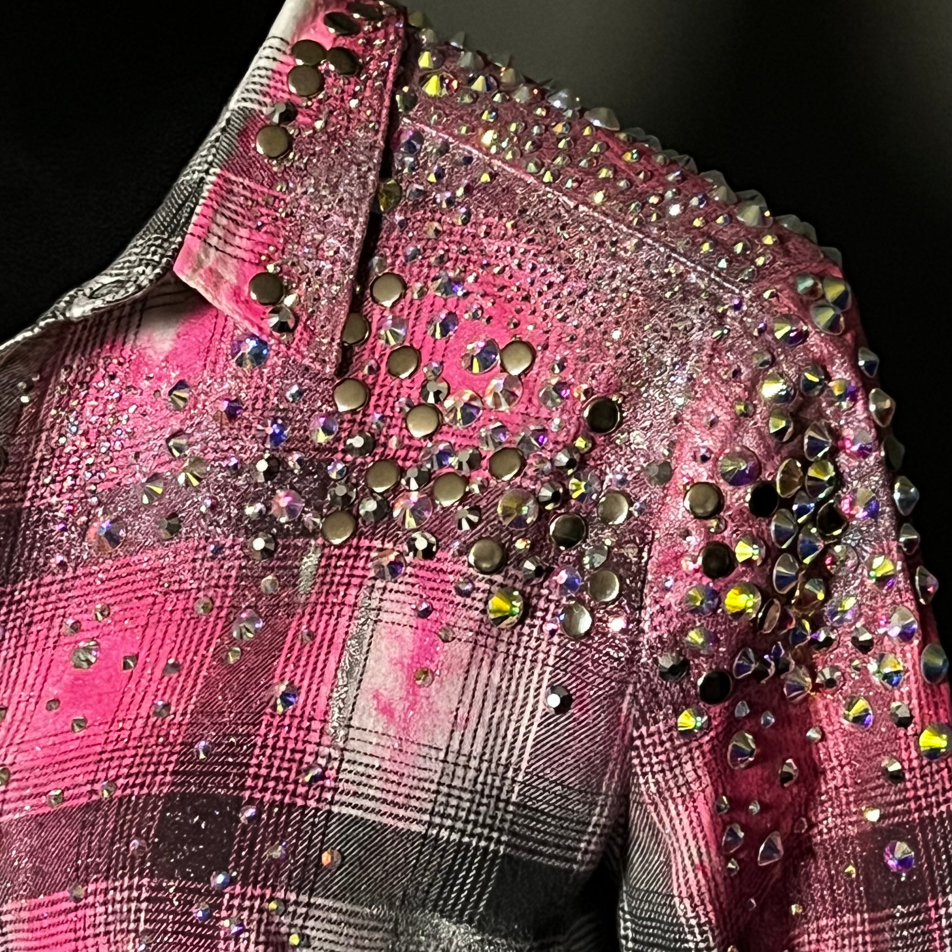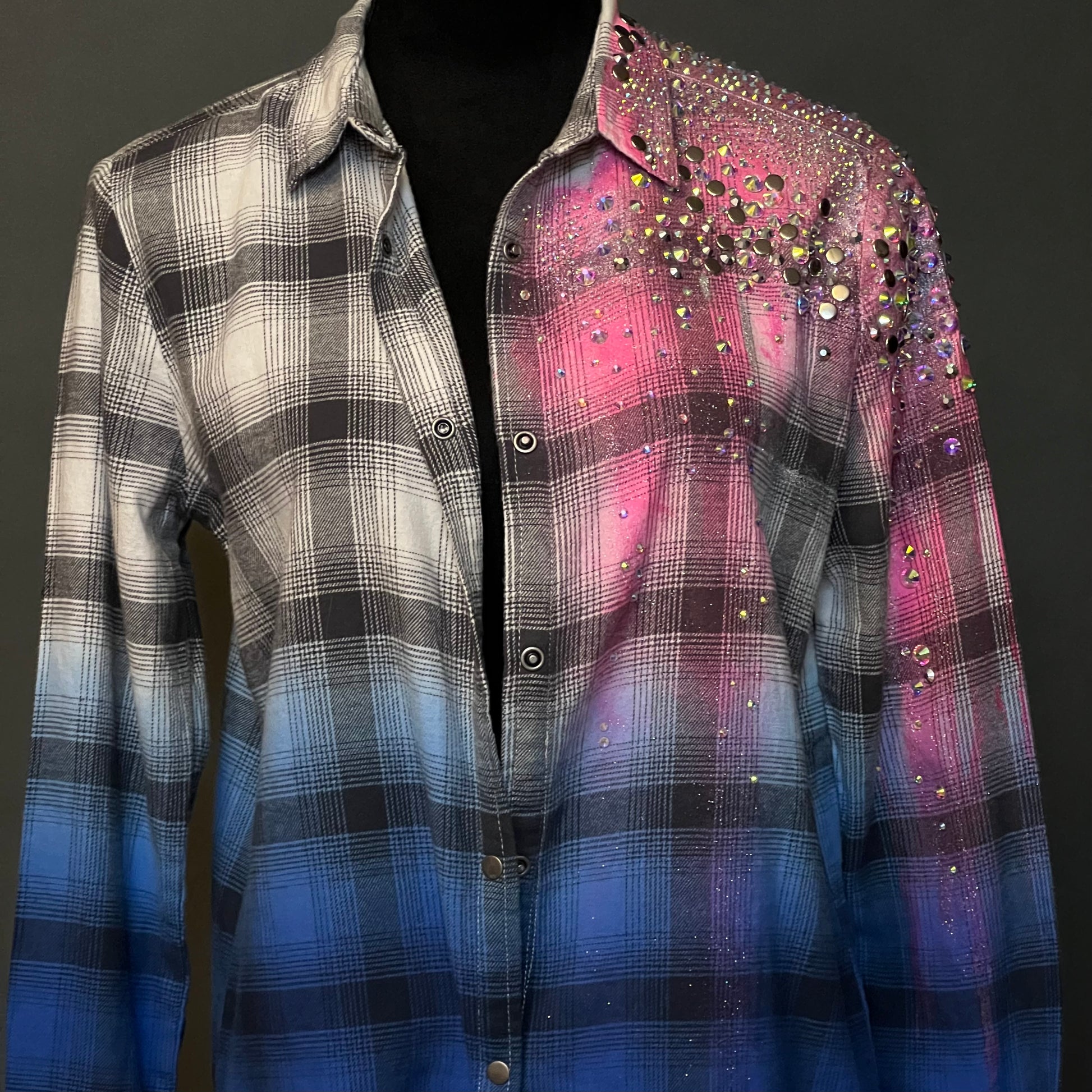 Plaid button down shirt featuring an ombré effect and painted with acrylic for a cosmic look enhanced by hundreds of artfully and delicately hand-placed gemstones anew studs. This luminous style will dazzle and make a lasting impression ;)