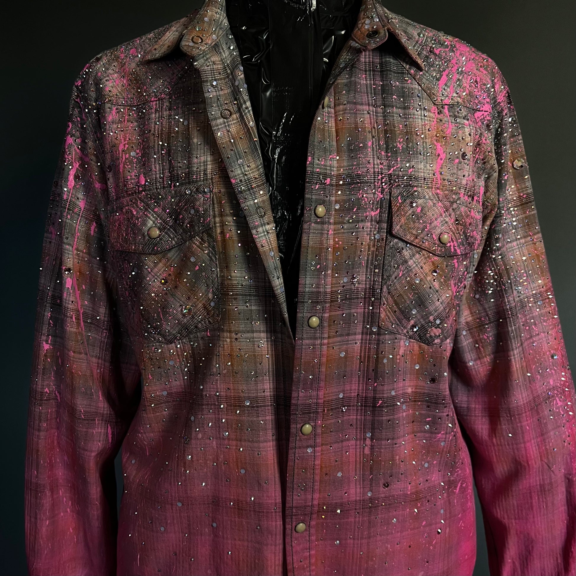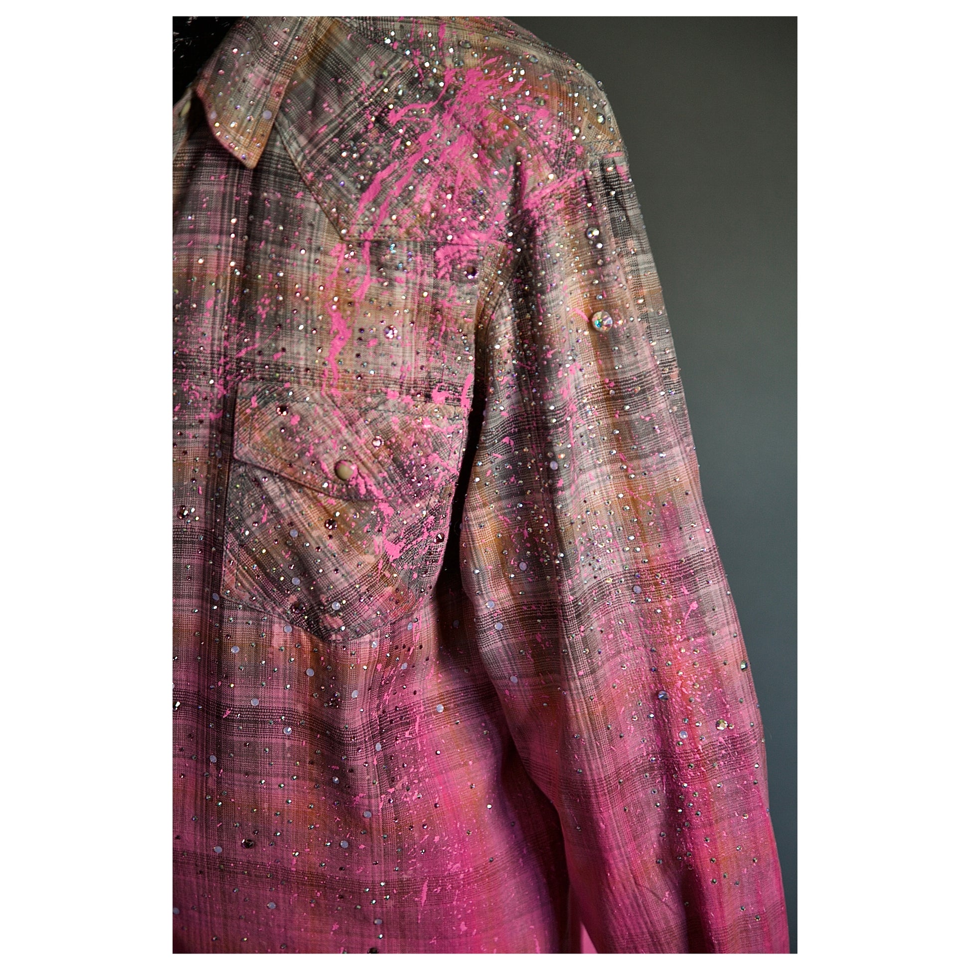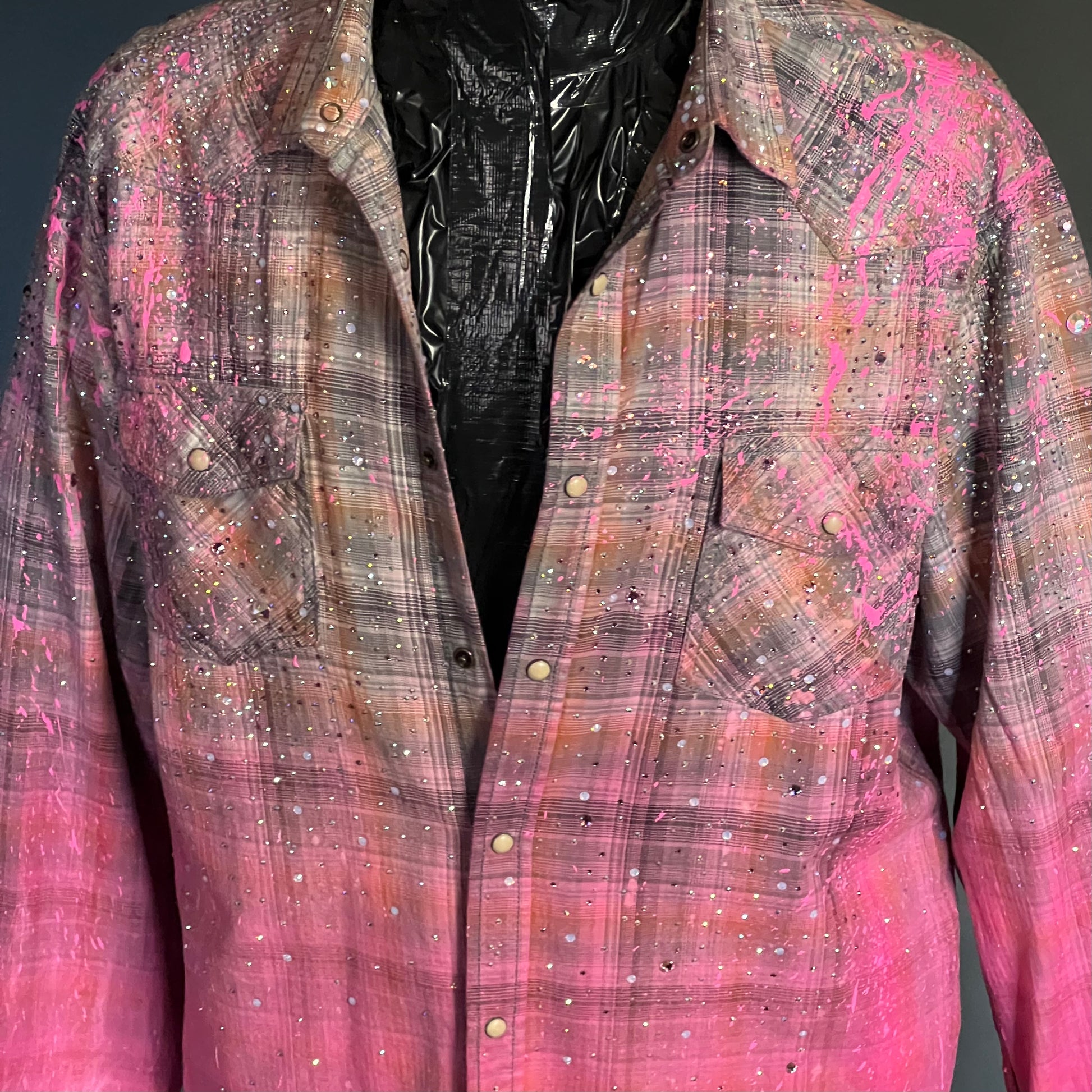 Plaid shirt featuring a bleached out ombré effect, dyed with hot pink pigment and acrylic paint splatter. Enhanced by thousands of artfully and delicately hand-placed gemstones of smaller sizes for a high lux, cosmic effect. Our luminous style will be sure to turn heads and leave a lasting impression ;)