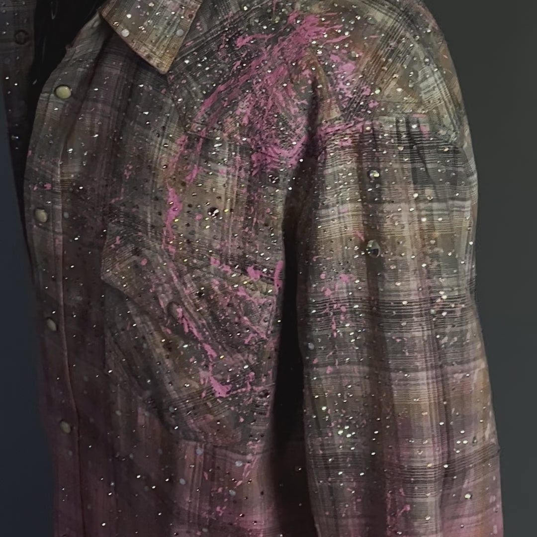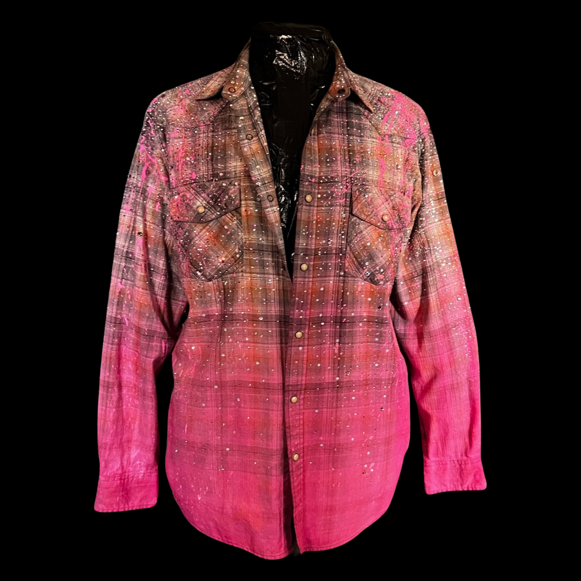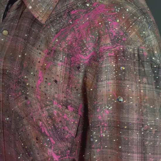 Plaid shirt featuring a bleached out ombré effect, dyed with hot pink pigment and acrylic paint splatter. Enhanced by thousands of artfully and delicately hand-placed gemstones of smaller sizes for a high lux, cosmic effect. Our luminous style will be sure to turn heads and leave a lasting impression ;)