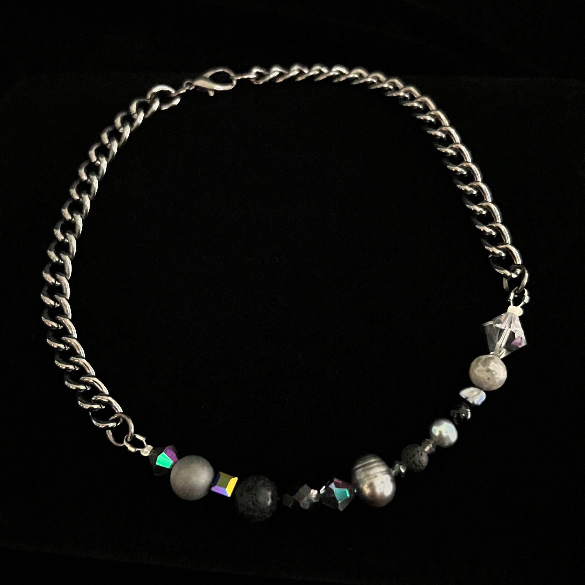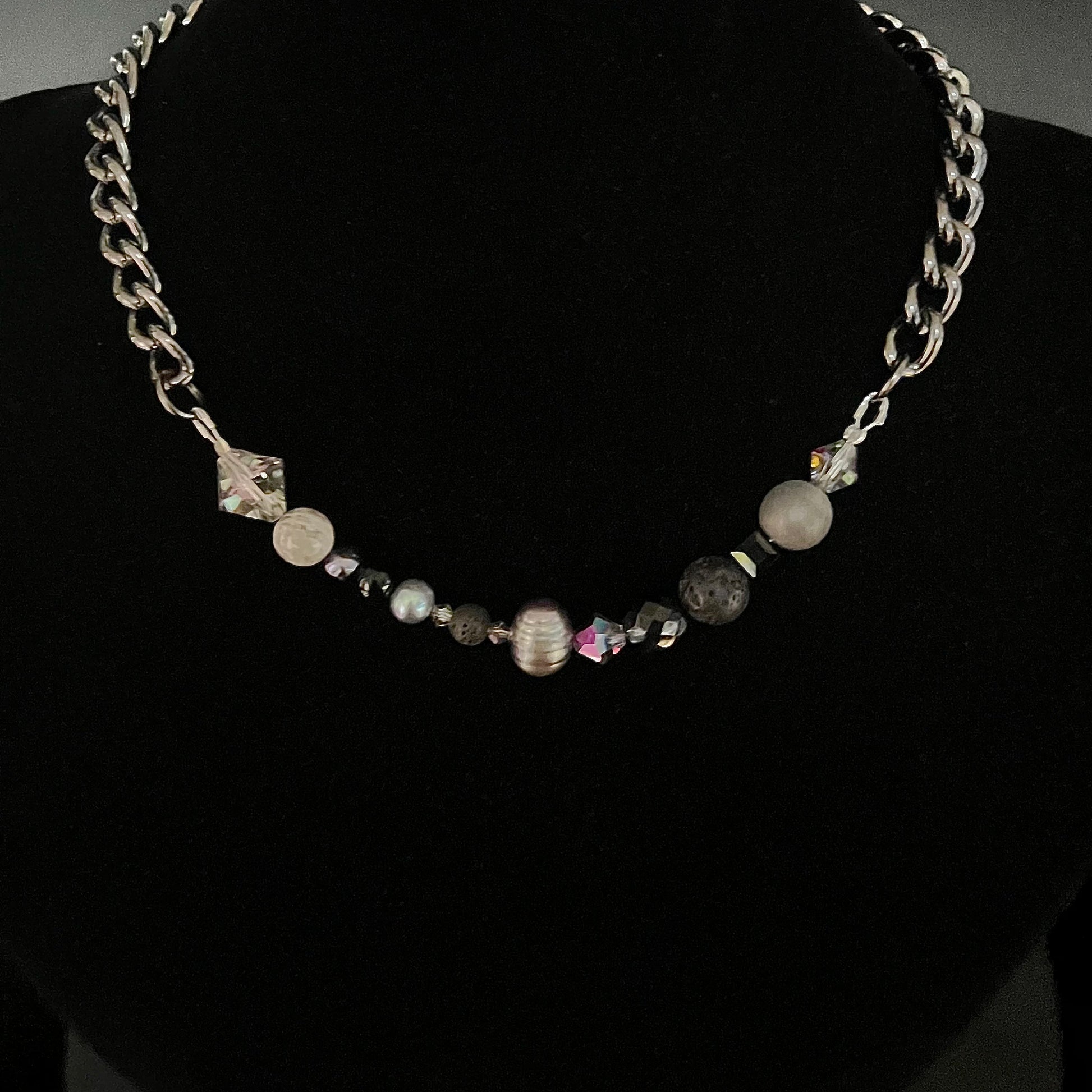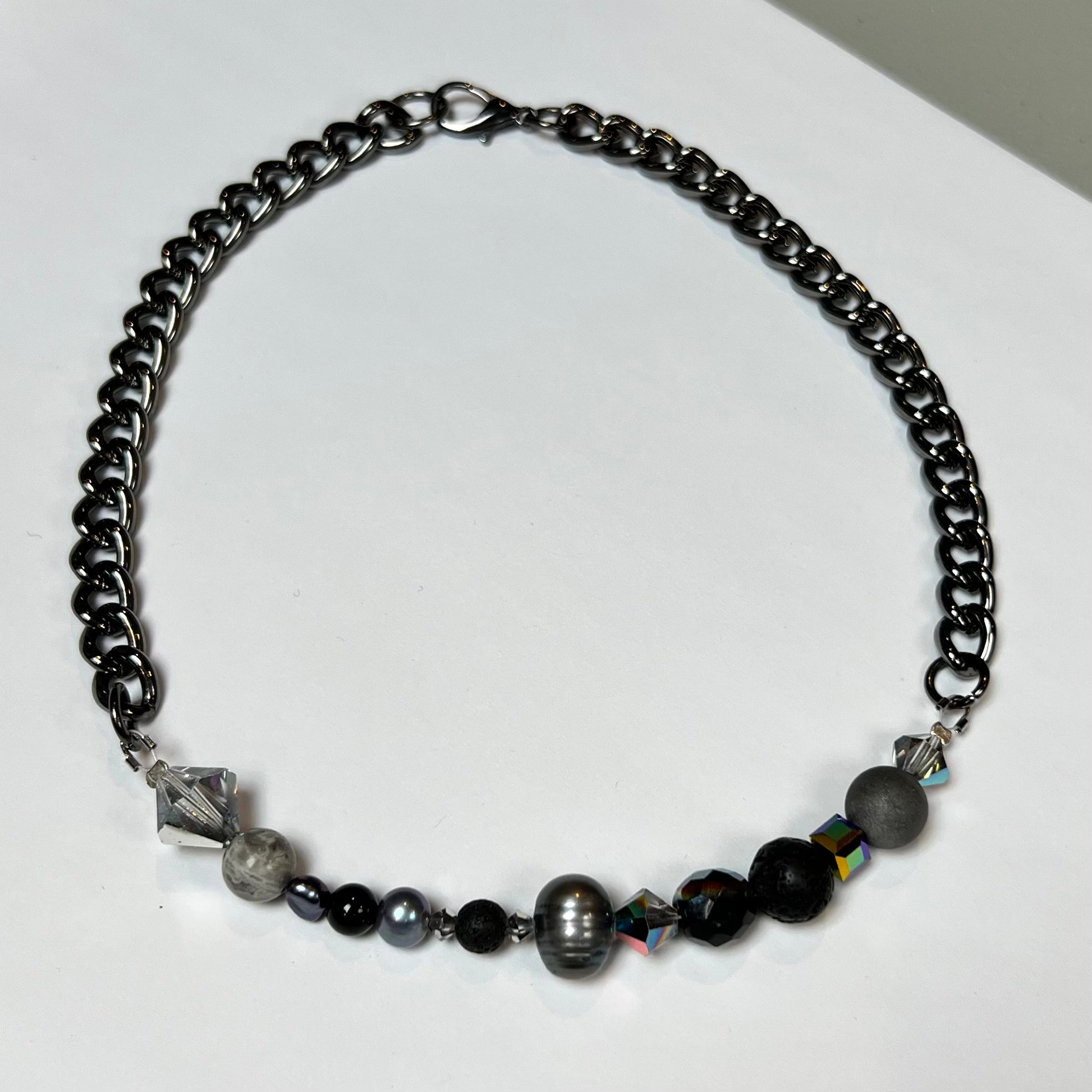 Black pearls swarovski and Lava make up this one of a kind necklace.